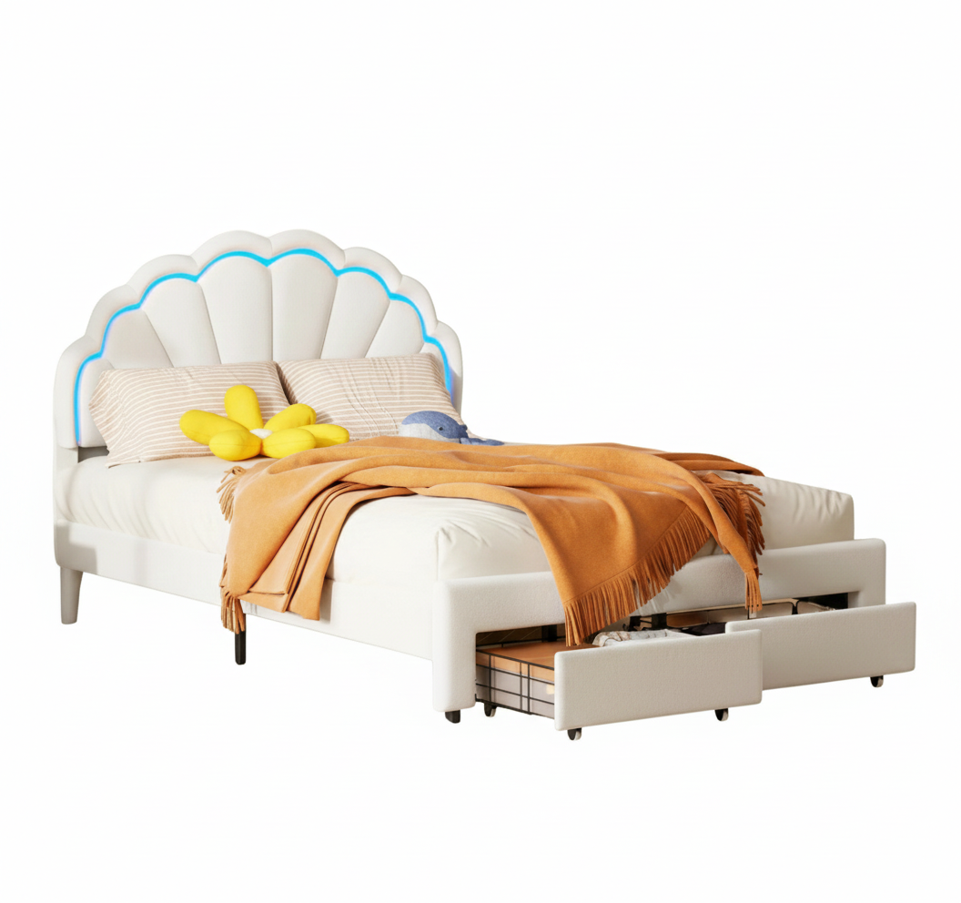 Het bloemvormige hoofdbord voegt een uniek en uitnodigend decoratief accent toe, perfect voor een kinderkamer. De geïntegreerde ledstrip accentueert de bloemblaadjes en creëert een zachte sfeer. De afgeronde lijnen aan de zijkanten optimaliseren de ruimte en versterken het gevoel van visueel comfort. De witte fluwelen bekleding past naadloos bij een modern of Scandinavisch interieur.