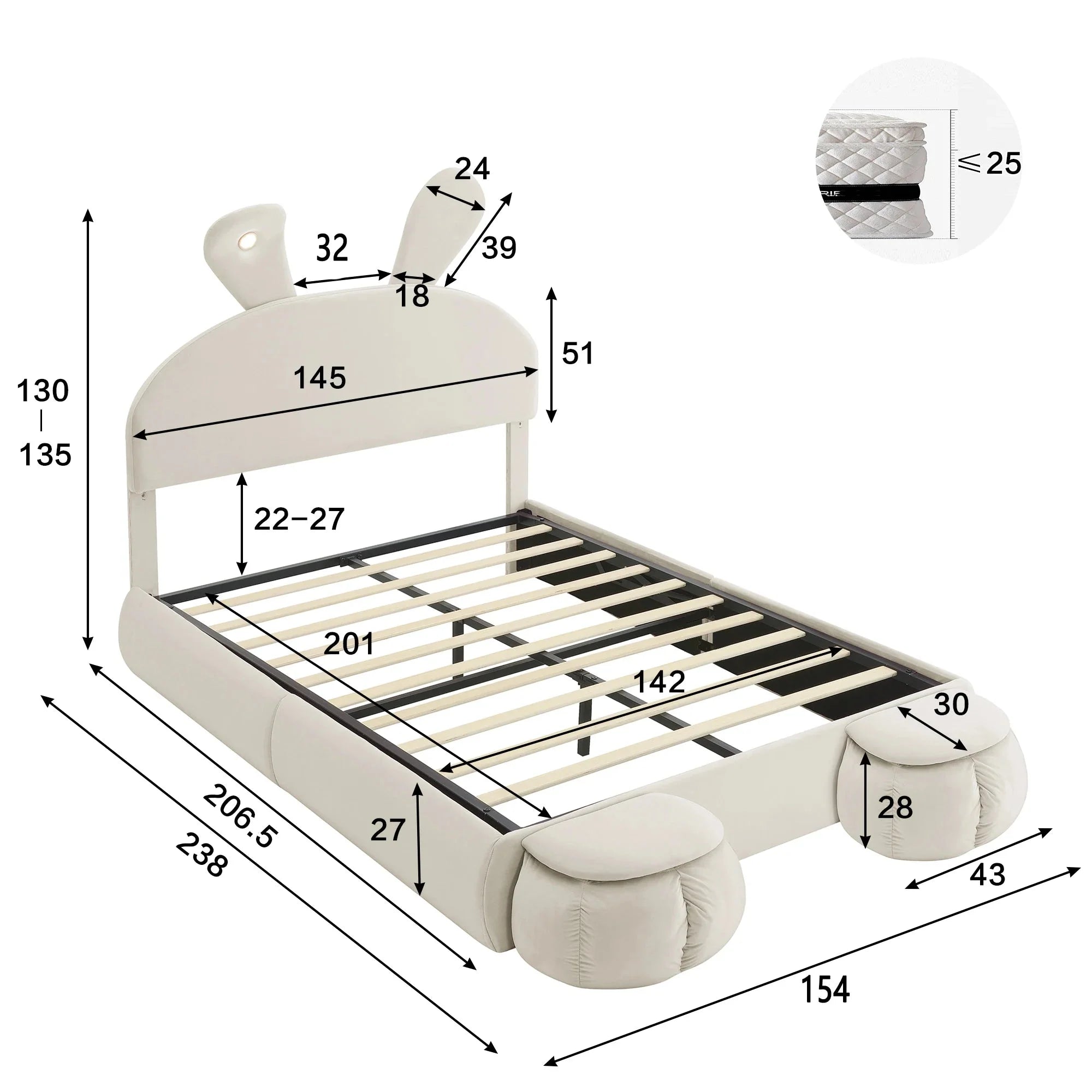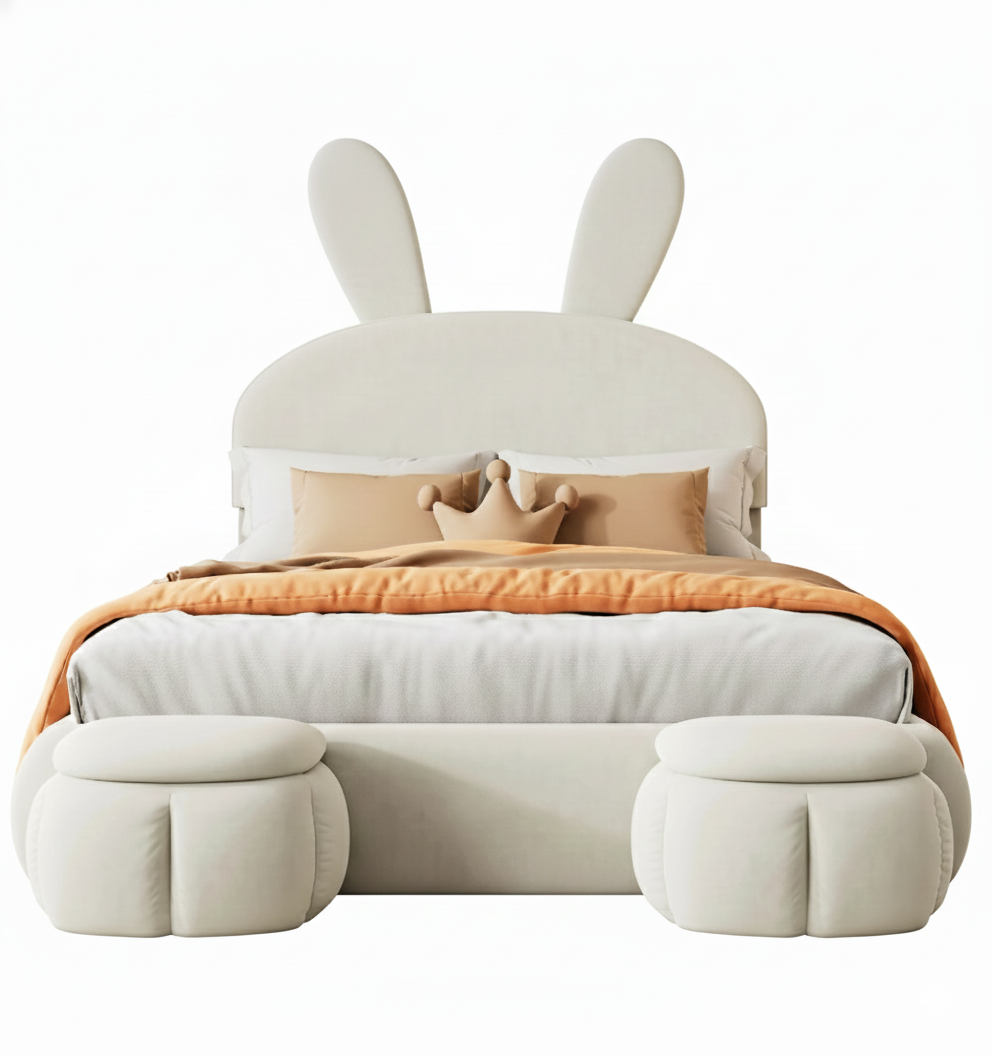 Dit tweepersoonsbed van 140x200 cm combineert een speels ontwerp met moderne functionaliteiten. Met zijn konijnvormige hoofdeinde en geïntegreerde ledverlichting creëert het een warme en uitnodigende sfeer, ideaal voor een kinder- of tienerkamer. Het comfortabele ontwerp en de standaardafmetingen maken het een hoogwaardig alternatief voor een goedkoop tweepersoonsbed, zonder in te leveren op betrouwbaarheid.