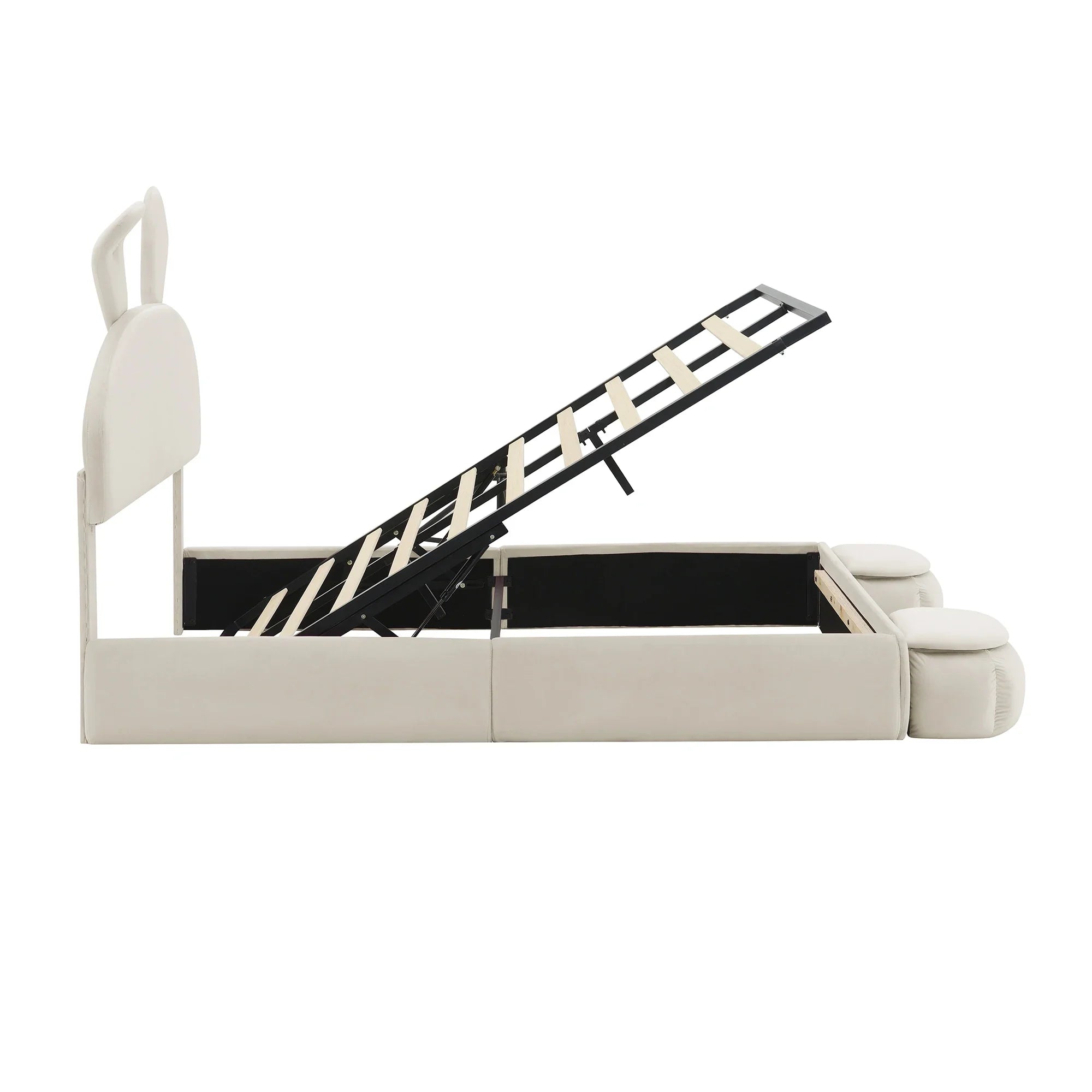 Het verstevigde metalen frame en de houten latten bieden stabiele ondersteuning voor een gewicht tot 200 kg. De beige fluwelen bekleding zorgt voor zachtheid en een warme uitstraling, terwijl het in twee standen verstelbare hoofdeinde voor optimaal comfort zorgt. Een ontwerp dat zowel esthetisch aantrekkelijk als functioneel is, perfect voor een ombouwbaar tweepersoonsbed voor kinderen .