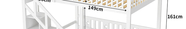 La structure associe bois massif et finition blanche soignée, offrant une excellente durabilité et un style moderne. L’escalier latéral intègre plusieurs compartiments de rangement, parfaits pour organiser jouets, vêtements ou livres, répondant aux attentes d’un lit mezzanine avec rangement ou d’une solution gain de place.
