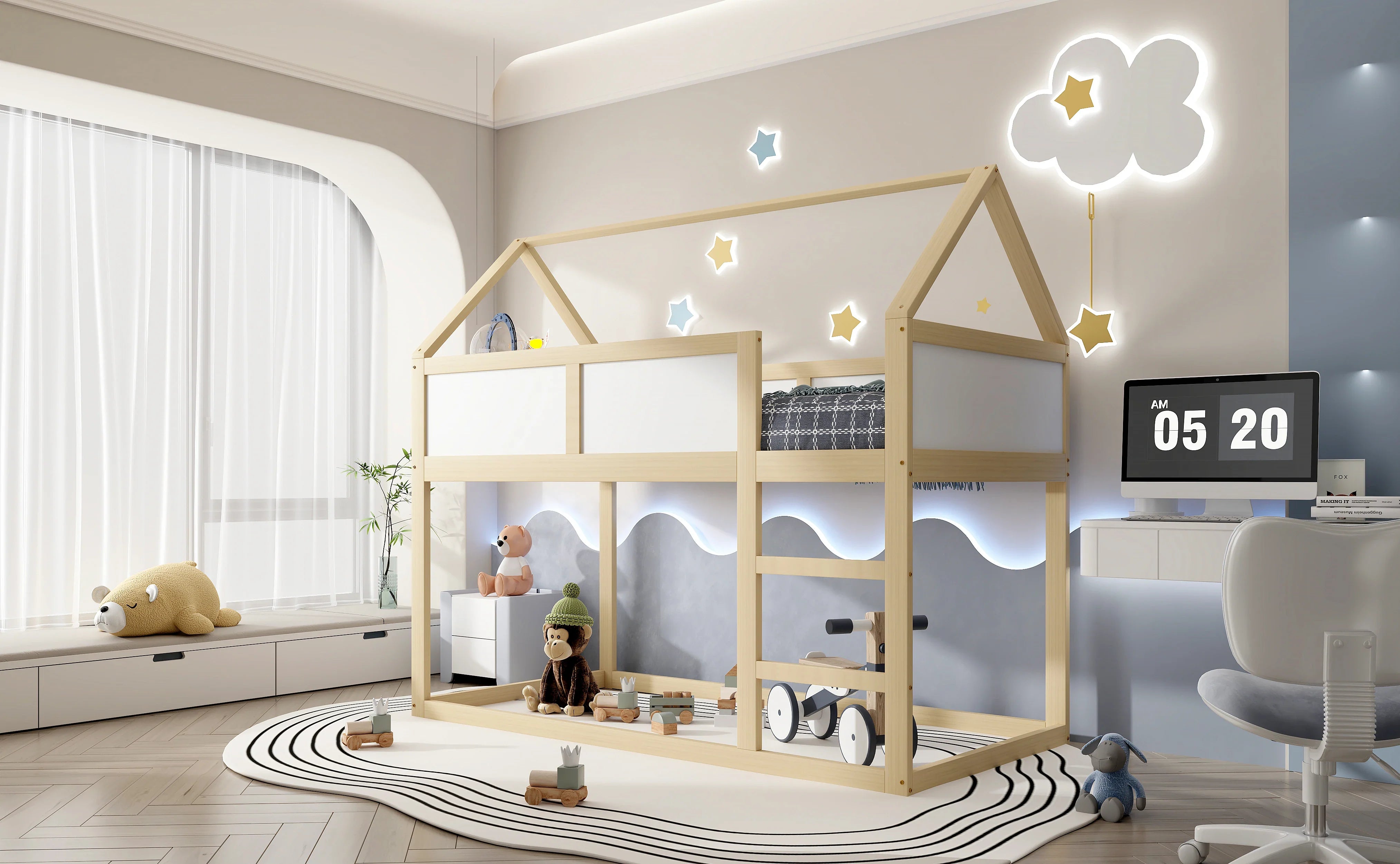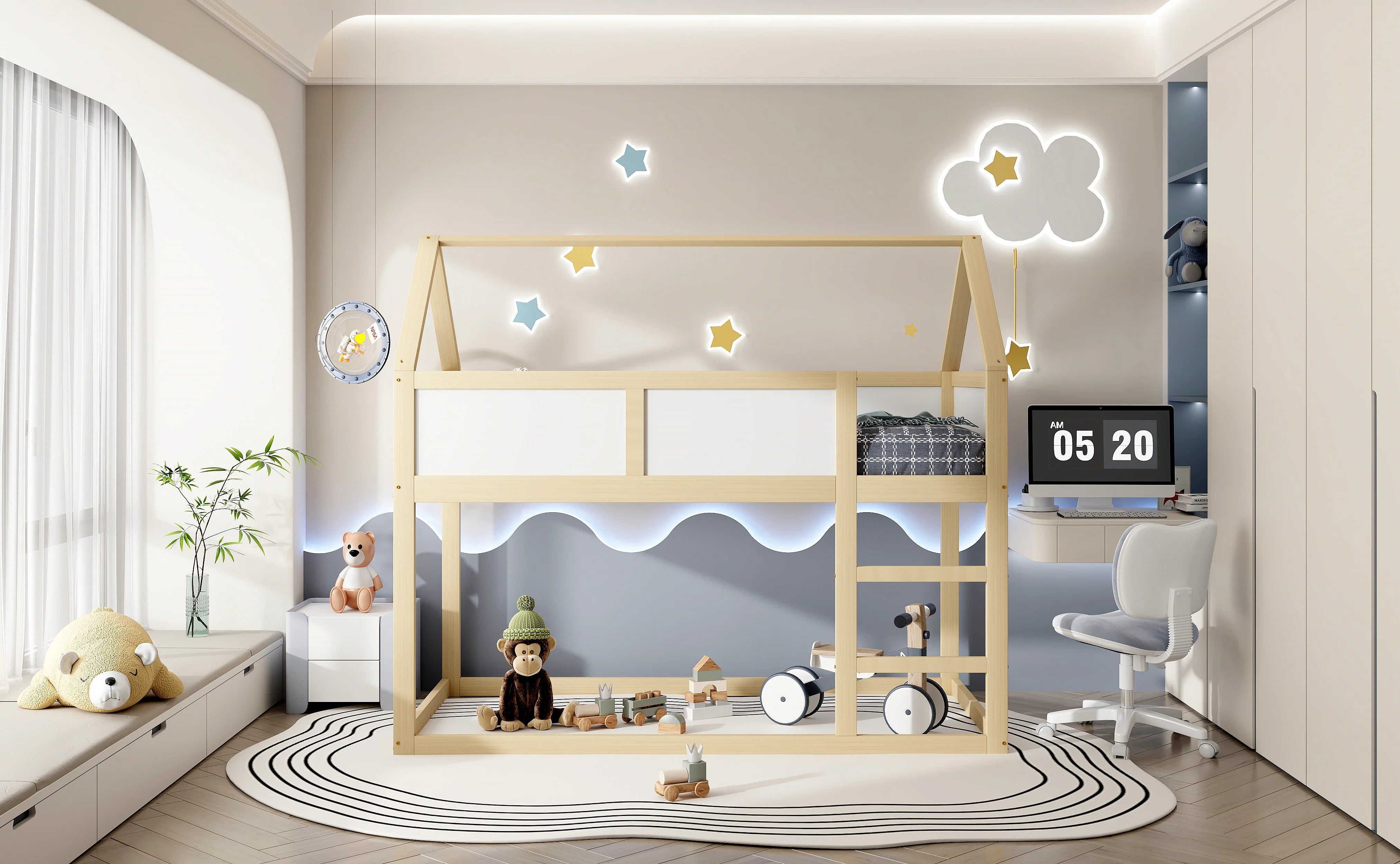 Son design moderne couleur bois et blanc permet de l’intégrer dans n’importe quel style de décoration. Le dessous libre peut devenir un coin lecture, un espace créatif ou un rangement supplémentaire, parfait pour garder une chambre bien organisée. Un excellent choix pour un lit mezzanine bois, un lit mezzanine avec rangement ou un lit destiné à optimiser l’espace au quotidien.